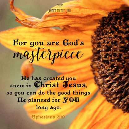 Ephesians 2:10 (NLT)10 For we are God’s masterpiece. He has created us anew in Christ Jesus, so we can do the good things he planned for us long ago.